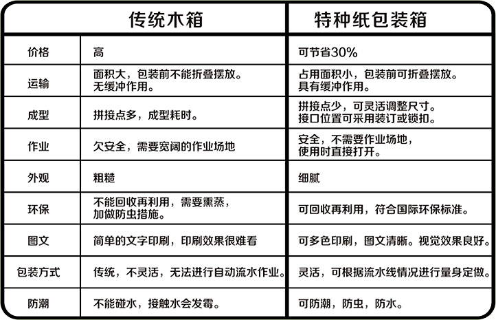瓦楞紙箱在汽車配件包裝上越來越得到大量應(yīng)用,跟它本身所具備的特點是分不開的。下面卓爾雅用一張表格,幫您清晰認(rèn)識紙箱包裝相比傳統(tǒng)木箱包裝的優(yōu)勢在哪里?